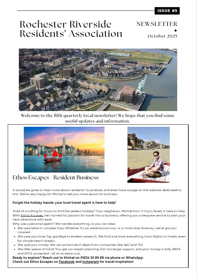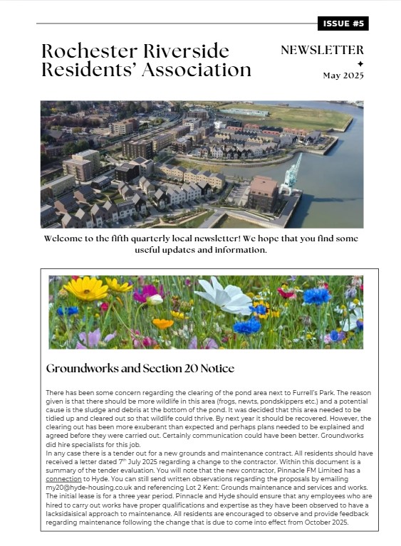 The Residents’ Association was formed in May 2023 and the 13th November 2025 will mark the third annual general meeting. The Residents’ Association has 240 members signed up to the mailing list which is fantastic and there is also the Rochester Riverside Facebook page.